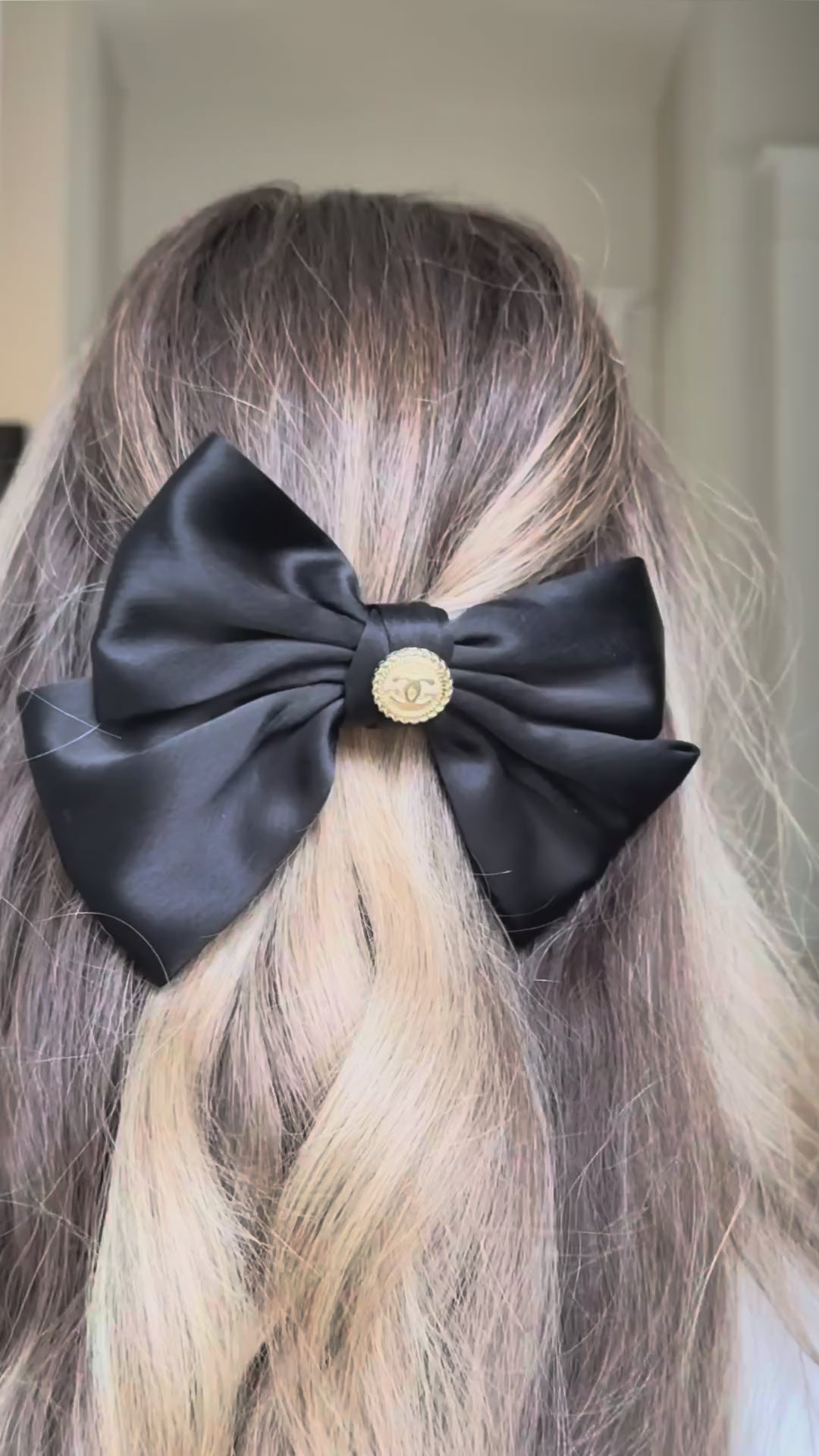 An oversized black satin bow adorned with an authentic Chanel-stamped button—your perfect new year, new meaccessory. Each button is unique and may differ from photos shown.